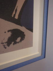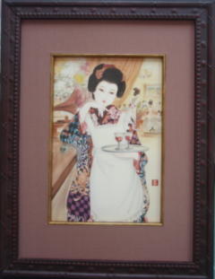 | ・佃 喜翔さんのポストカードの額装です。絵の 雰囲気を壊さないよう、和風の布マットを使用し ました。面金加工を施したので、豪華な仕上がり になりました。 |
