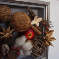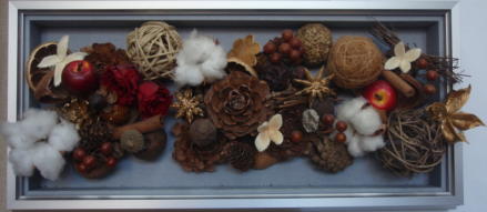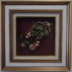 ・アンティーク調の油彩額にドライフラワーの組み合わせです。バックボードにワインレッド色の紙マットを使用、花はアルミの紐で固定しています。 | ||||||||||